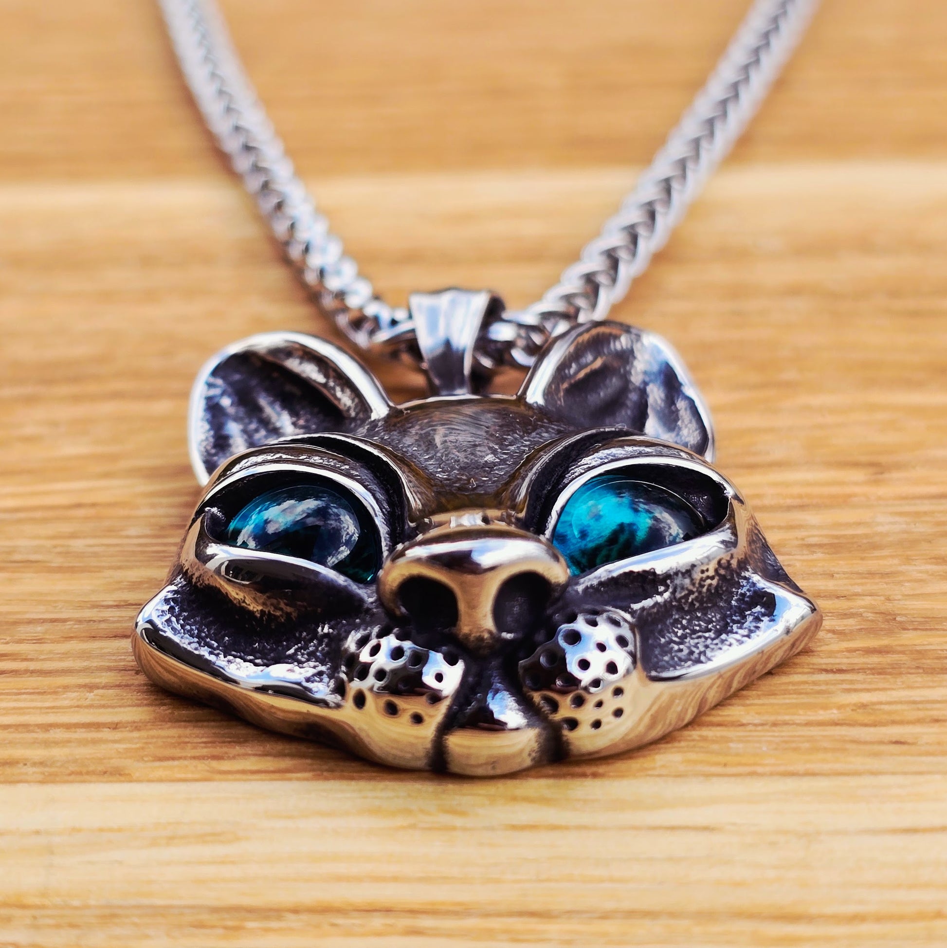 The expressive green eyes reflect intuition and sharp perception, giving the pendant depth and quiet authority.