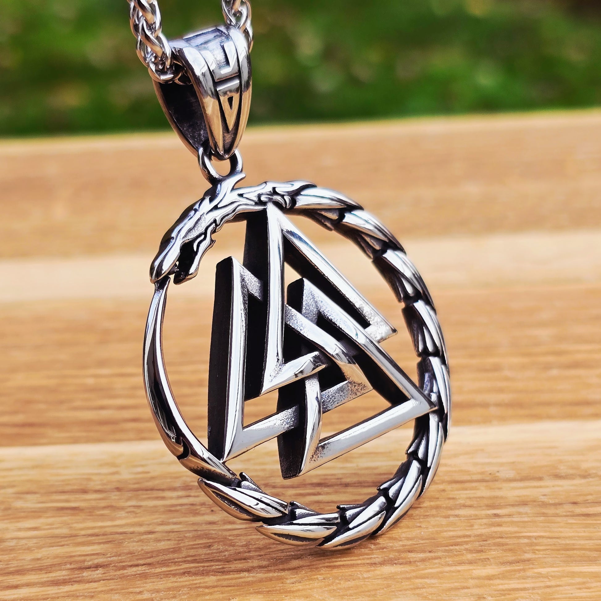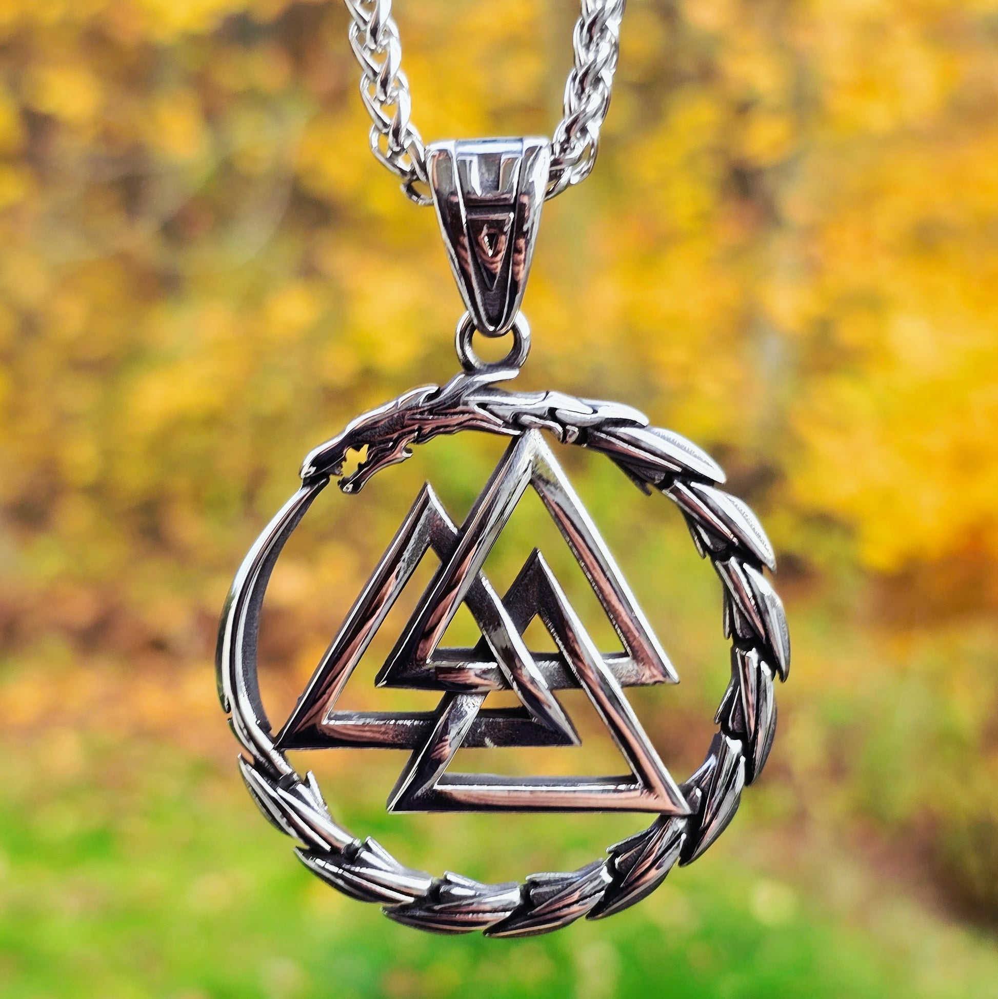 The Valknut Nidhöggr necklace unites two powerful forces of Norse mythology, Odin’s Valknut and the world dragon Nidhöggr.